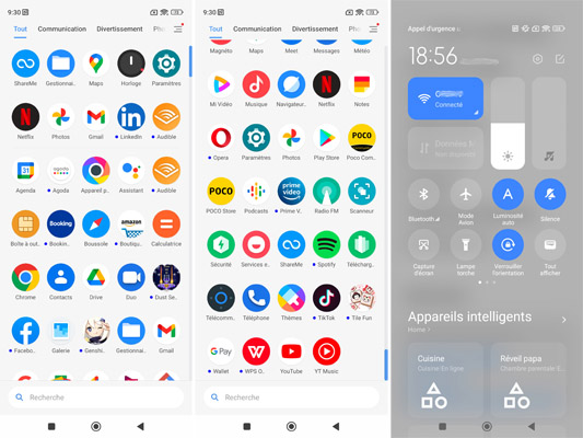 Le Poco X4 GT est animé par le système Android 12 avec une surcouche logicielle MIUI 13.0.6 au moment de notre test. La mise à jour d’Android datait du 1er août 2022 ce qui est assez récent pour un mobile testé fin août/début septembre. On retrouve, sur ce Poco X4 GT, la même interface que celle qui est proposée au sein des smartphones Xiaomi et notamment, dans les paramètres, la possibilité de se connecter à son compte Mi. Un balayage de l’écran du haut vers le centre depuis le côté gauche du poinçon du capteur photo frontal permet d’accéder aux notifications tandis que le même geste effectué du côté droit déroule les principaux raccourcis des fonctions et la possibilité de gérer le niveau de luminosité. Les appareils connectés de la maison s’y trouvent également pour y accéder plus rapidement que d’avoir à ouvrir l’application Google Home.