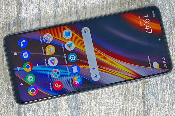 L’écran du Poco X4 GT est de type LCD alors que les autres concurrents proposent des dalles AMOLED offrant des couleurs plus fidèles et des contrastes abyssaux contre des noirs moins contrastés ici. La définition est de 1080x2460 pixels sur 6,6 pouces, ce qui est assez grand. Les bords de l’écran ne sont pas spécialement fins. Le plus épais des quatre est le menton inférieur. Au centre, tout en haut, il y a un poinçon pour abriter le capteur photo frontal et ne gênant pas l’affichage global qui occupe 85% de la façade. Toutefois, notez que le poinçon est tout de même cerclé d’un halo noir qui renforce un peu sa présence surtout sur des fonds clairs.
