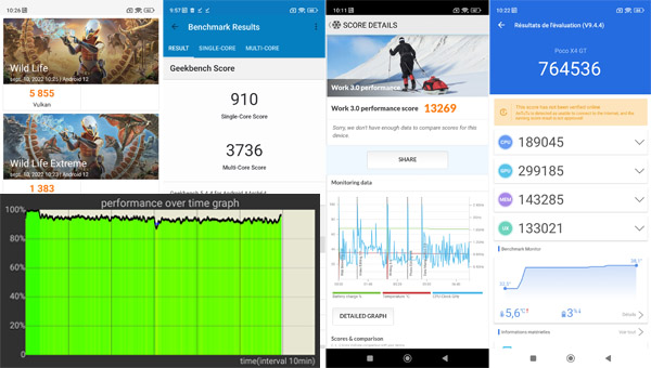 Afin d’évaluer les performances brutes du Poco X4 GT, nous l’avons soumis à plusieurs outils de mesure et dont voici les principaux résultats. Le smartphone se montre extrêmement régulier dans ses performances comme on peut le voir sur la capture de l’application CPU Throttling délivrant presque tout son potentiel jusqu’à la fin du test, une belle prouesse dont ne sont pas capables toutes les puces de nos smartphones, loin de là.