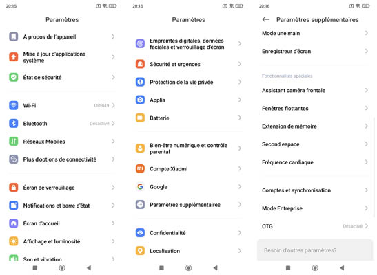La mise en page peut également suivre différents schémas. Difficile d’y voir un changement fondamental par rapport à la surcouche logicielle qui était MIUI auparavant et maintenant qui se fait appeler HyperOS. En effet, tous les paramètres sont organisés de la même façon et on n’est pas dépaysé. Les options de bien-être numérique et de contrôle parental sont présentes comme les fonctions spéciales à l’image des fenêtres flottantes et du second espace qui sert à mettre à l’abri des regards certaines applications. Rappelons aussi la mesure de la fréquence cardiaque. L’assistant de caméra frontale est également disponible ainsi que l’option pour gérer l’extension de mémoire vive. C’est exactement la même interface que sur le Redmi Note 13 Pro, par exemple.