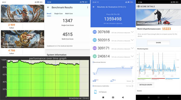 Comme tous les autres smartphones testés, nous l’avons soumis à plusieurs outils de mesure de performances dont voici les principaux résultats (à froid). Même soumis à rude épreuve, pour ne rien gâcher, le mobile reste parfaitement tempéré, ce qui est toujours une bonne chose. En outre, on apprécie aussi le fait qu’il livre son plein potentiel pendant la phase de test. Il ne descend jamais en dessous des 85%, ce qui est loin d’être le cas des autres chipsets.
