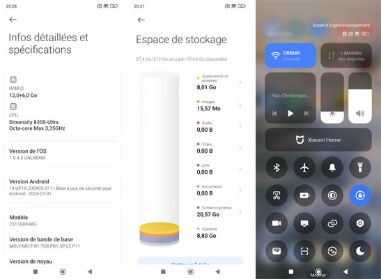 Le POCO X6 Pro est animé par Android 14 avec une surcouche logicielle HyperOS 1.0.4.0 au moment de notre test. La mise à jour de sécurité datait du 1er janvier 2023 ce qui ne peut pas être plus récent lorsqu’on sait que les tests ont été réalisés courant février. Idem pour la mise à jour du système.