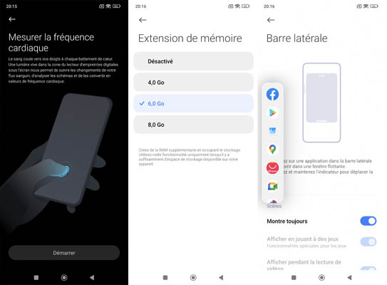 Si on fait le tour du smartphone, on peut voir la touche de mise en veille et celle qui permet de gérer le volume sur le profil droit. À la différence des POCO X4 Pro et POCO X5 Pro, le POCO X6 Pro a un lecteur d’empreintes digitales sous l’écran. C’est une position plus naturelle, de notre point de vue. S’il s’avère très réactif et offre une bonne expérience lors du déverrouillage de l’appareil, on peut toutefois regretter qu’il ne soit pas placé un peu plus haut. En effet, il est positionné à seulement 1,5 cm par rapport au bord inférieur, ce qui oblige à une petite gymnastique du pouce pour qu’il trouve naturellement sa place dessus. Comme le Redmi Note 13 Pro, par exemple, le lecteur d’empreintes du POCO X6 Pro a la particularité d’être capable de lire la fréquence cardiaque de l’utilisateur. Il s’agit d’une fonction spéciale qu’il faut activer dans les paramètres. Si les mesures sont assez précises, on regrette que cette fonction ne soit pas synchronisée avec une application adaptée.
