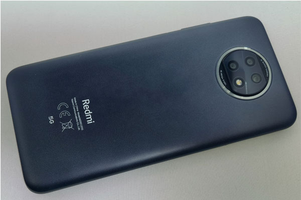 Au centre de la façade arrière de l'appareil, il y a le bloc photo. Celui-ci est inscrit dans un cercle et dépassant légèrement du reste de la coque. En position centrale, il ne déséquilibre pas l'appareil lorsqu'il est posé sur une surface plane. En bas, on peut voir quelques inscriptions, dont la plus intéressante : 5G. Pour le reste, on voit le logo Redmi, CE et la poubelle barrée signifiant qu'il n'est pas conseillé d'y jeter son mobile? Pas très classe ! On aurait vite fait de cacher cela derrière une coque de protection efficace.